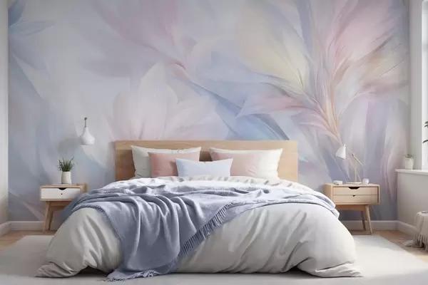 Fototapetes Mīkstas, pasteļtoņu lapas un spalvas rozā, zilas un dzeltenas krāsās, abstrakts un faktūrs apdruka Nr. w09634