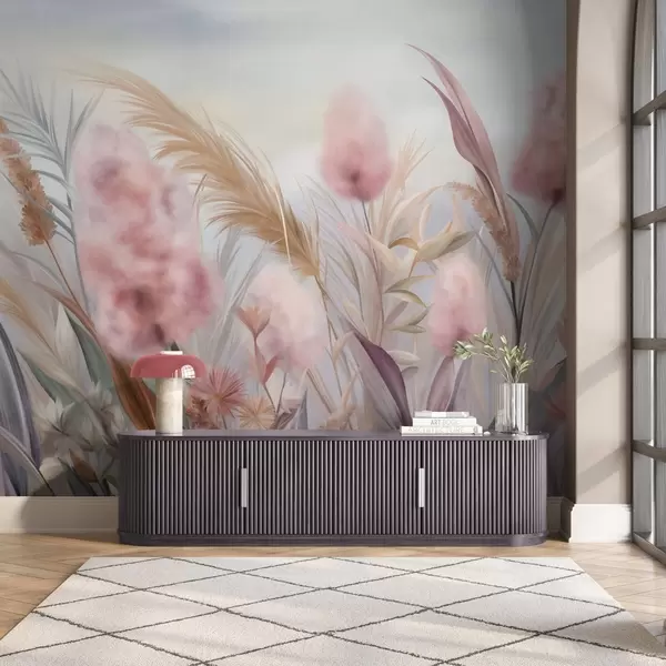 Fototapetes Rozā un smilškrāsas pampas zāle un citi kaltēti ziedi ar maigu, miglājošu debesi fonā Nr. w09635