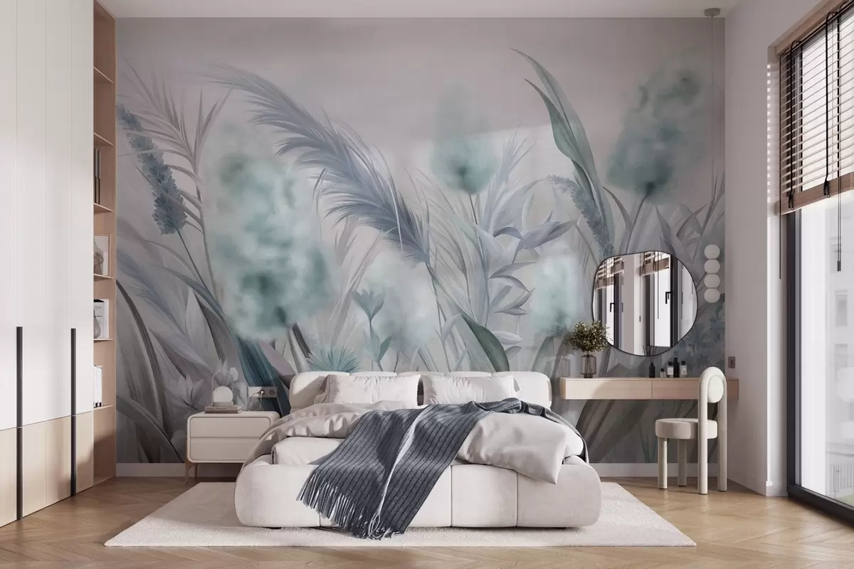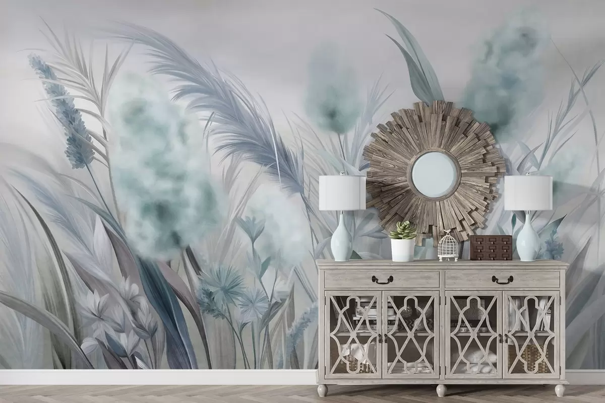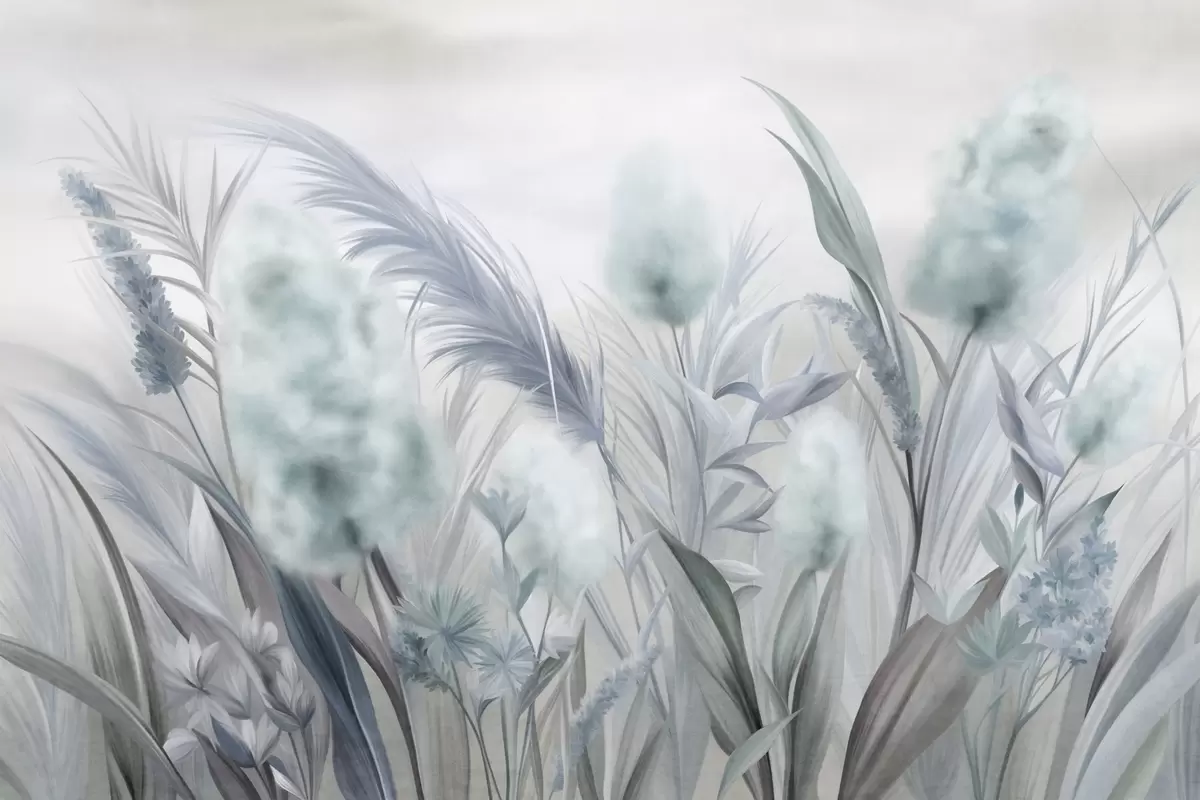 Fototapetes Zils un pelēks pampas zāle un citi kaltēti ziedi ar maigu, miglājošu debesi fonā Nr. w09635v1