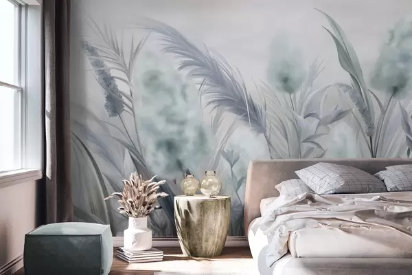 Fototapetes Zils un pelēks pampas zāle un citi kaltēti ziedi ar maigu, miglājošu debesi fonā Nr. w09635v1