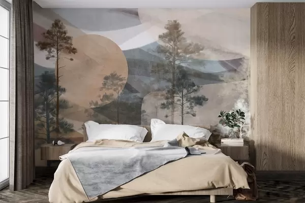 Fototapetes Augstas priedes klusā, faktūru bagātā ainavā ar abstraktām apļveida formām un slāņveida kalniem zemes toņos Nr. w09636