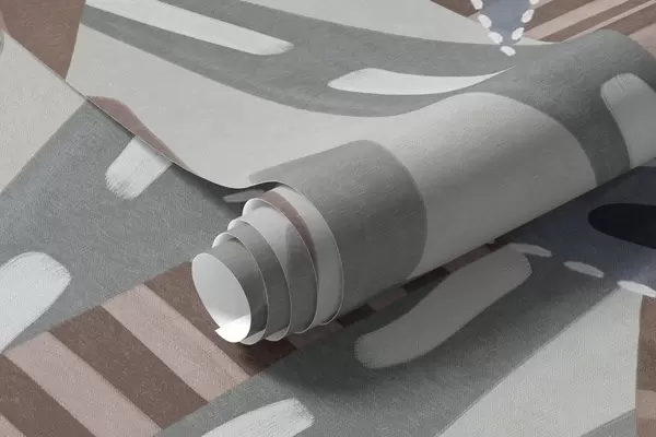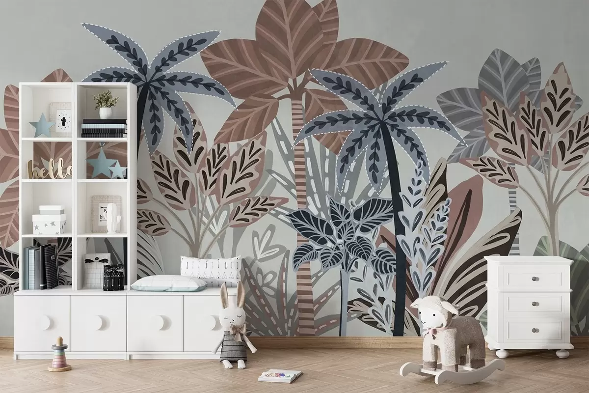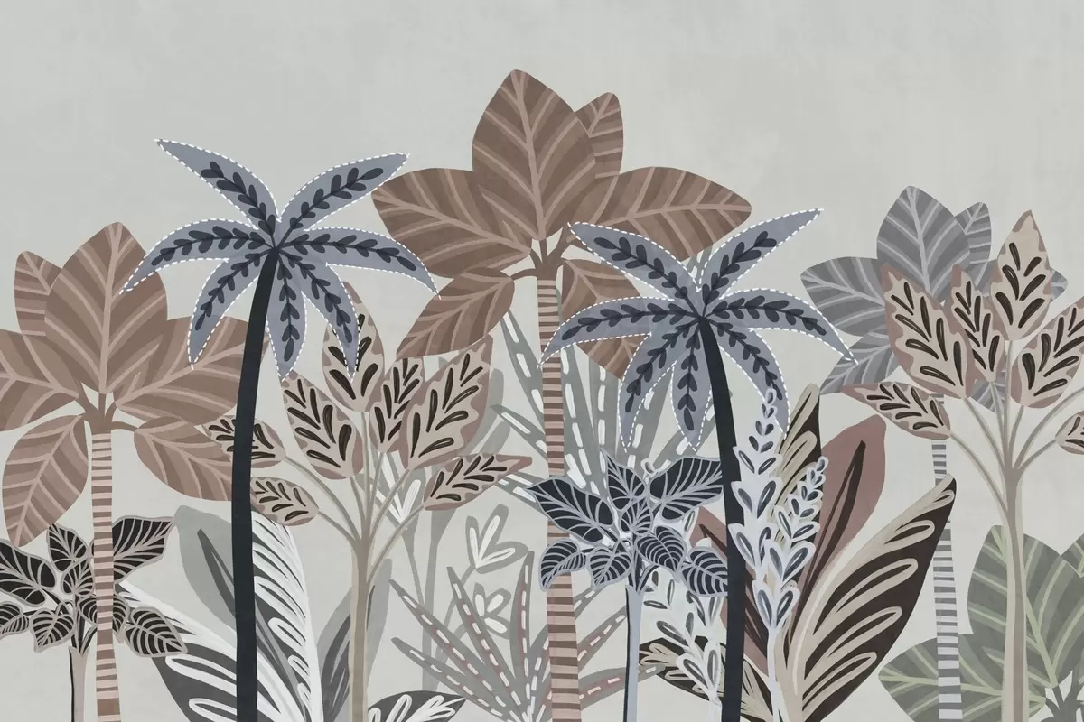 Fototapetes Teksturēti tropu augi un palmas ar klusinātiem toņiem dekoratīvā boho stilā uz pelēka fona Nr. w09639v1