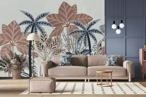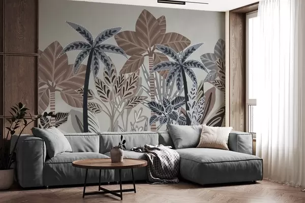Fototapetes Teksturēti tropu augi un palmas ar klusinātiem toņiem dekoratīvā boho stilā uz pelēka fona Nr. w09639v1