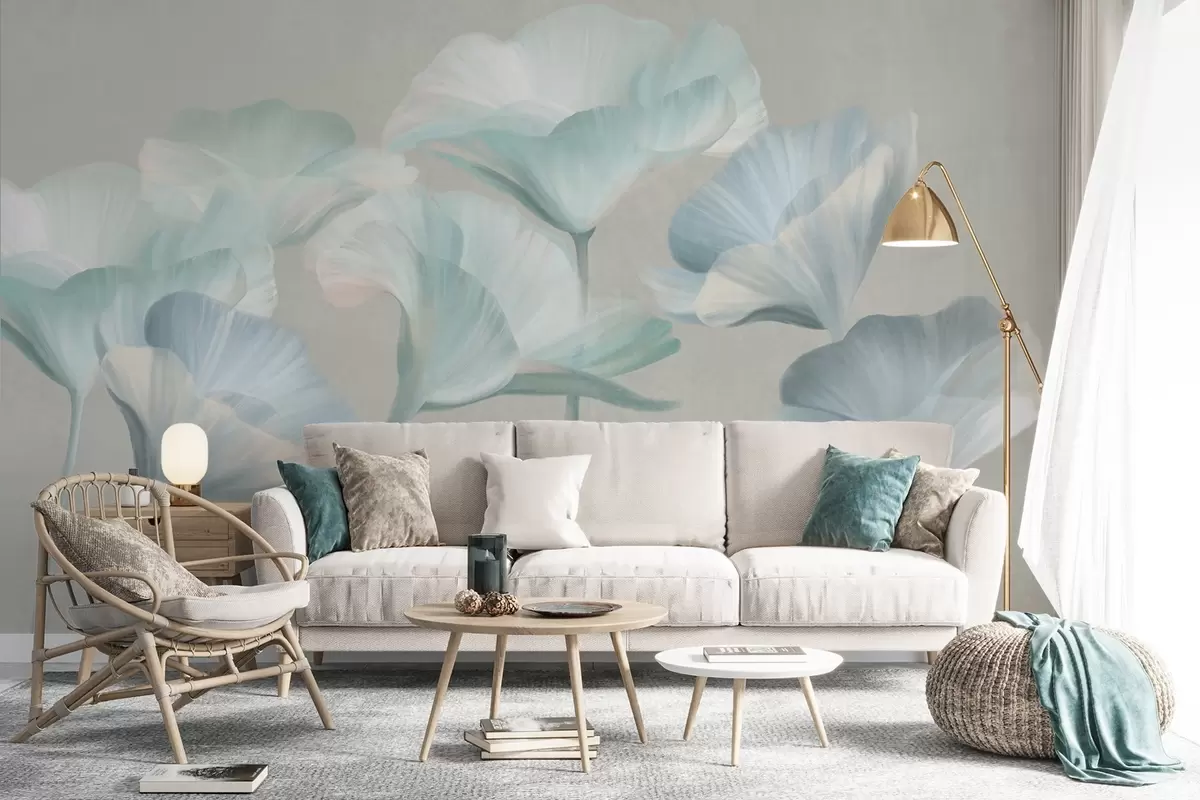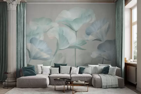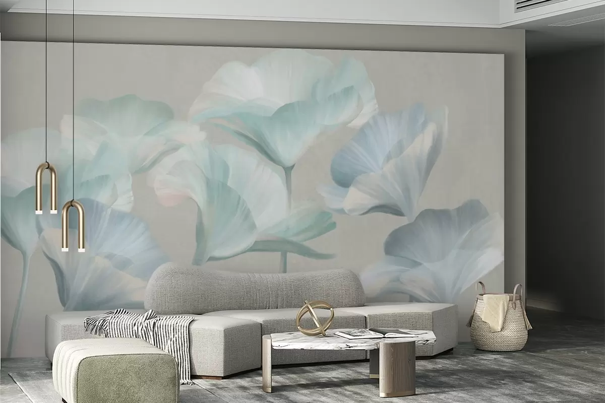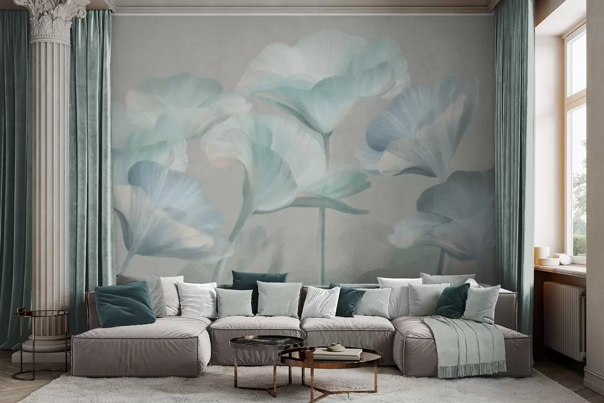 Fototapetes Bāli tirkīza krāsas teksturēti caurspīdīgi lotosa ziedi ar maigiem ziedlapiem uz klusā pelēkā fona Nr. w09640v2