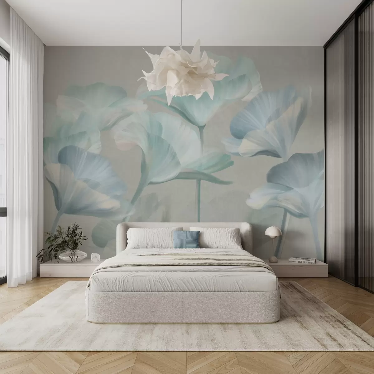 Fototapetes Bāli tirkīza krāsas teksturēti caurspīdīgi lotosa ziedi ar maigiem ziedlapiem uz klusā pelēkā fona Nr. w09640v2