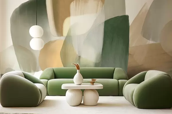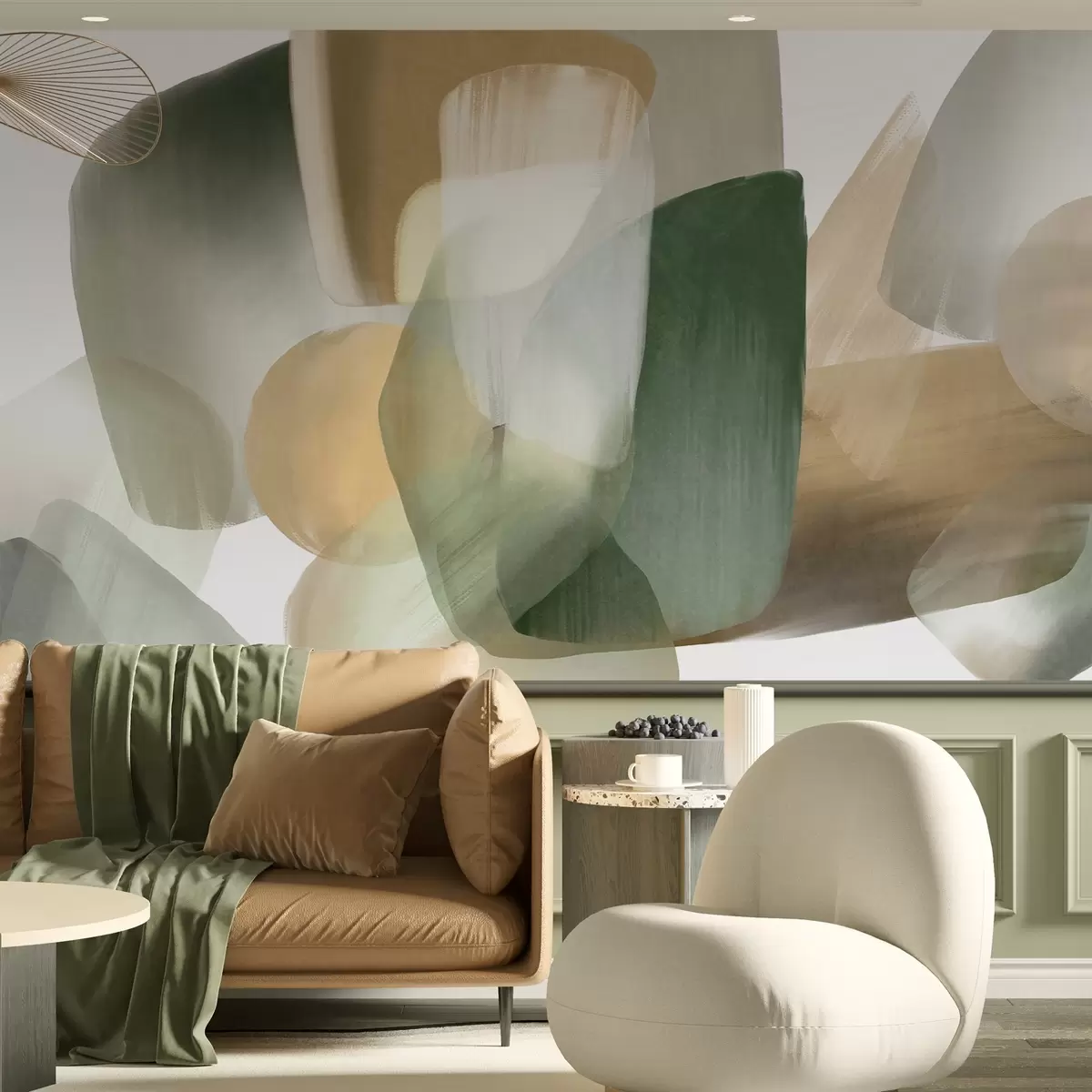 Fototapetes Abstraktas tekstūras formas klusinātos zaļos un smilškrāsas toņos, ar maigām malām un pārklājošām slāņiem Nr. w09642