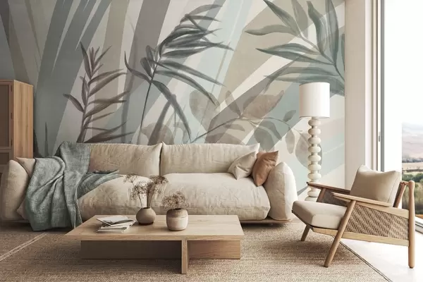 Fototapetes Augsta teksturēta zāle un lapas klusinātos zemes toņos, ar abstraktām līnijām fonā, radot organisku apdruku. Nr. w09643