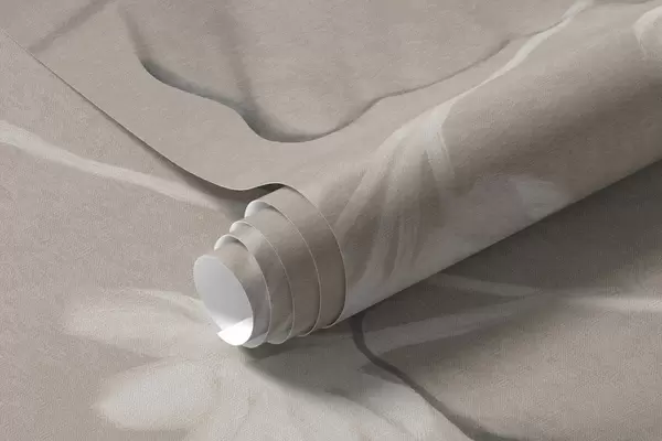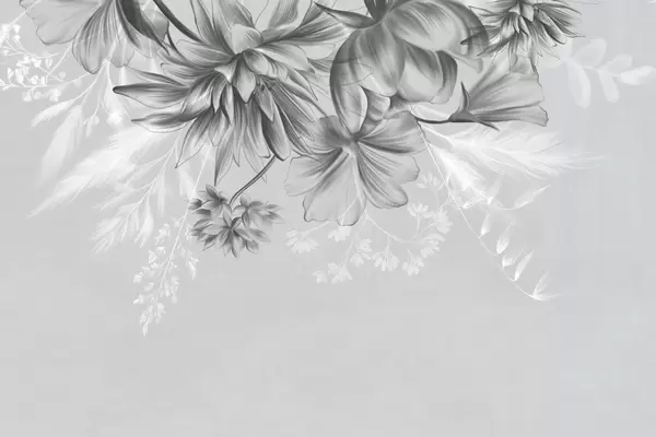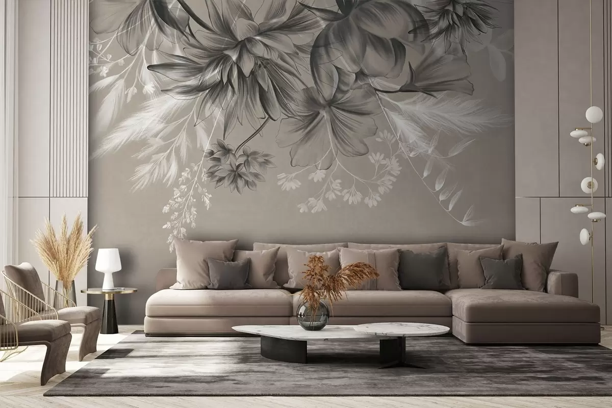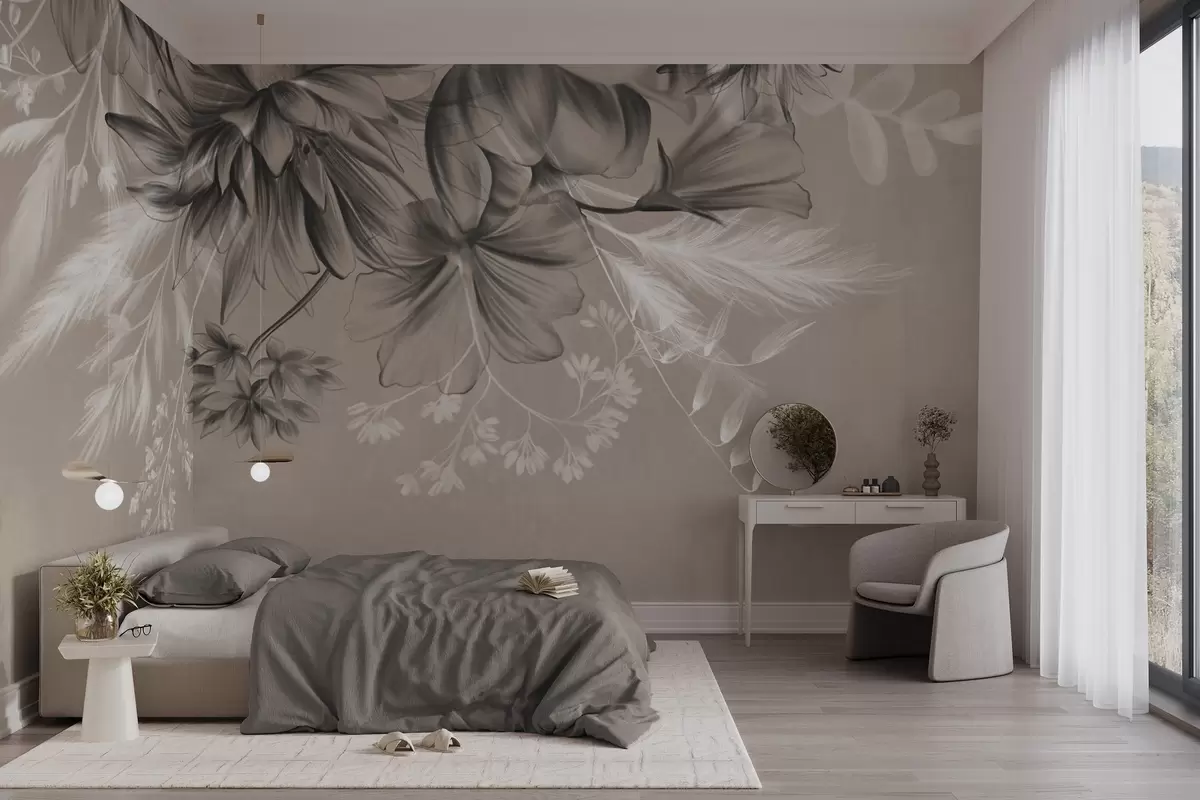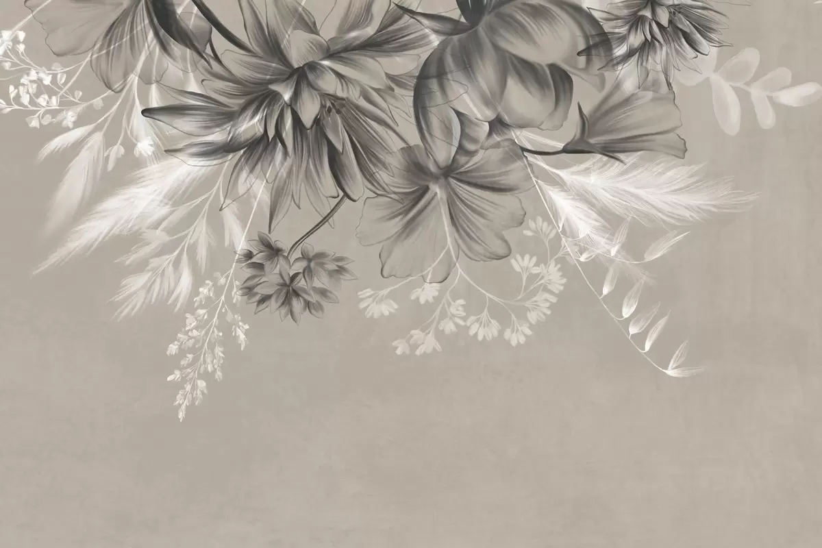 Fototapetes Teksturēti ziedi un papardes tumši pelēkā un baltā krāsā uz klusā smilškrāsas fona zīmējuma stilā Nr. w09644
