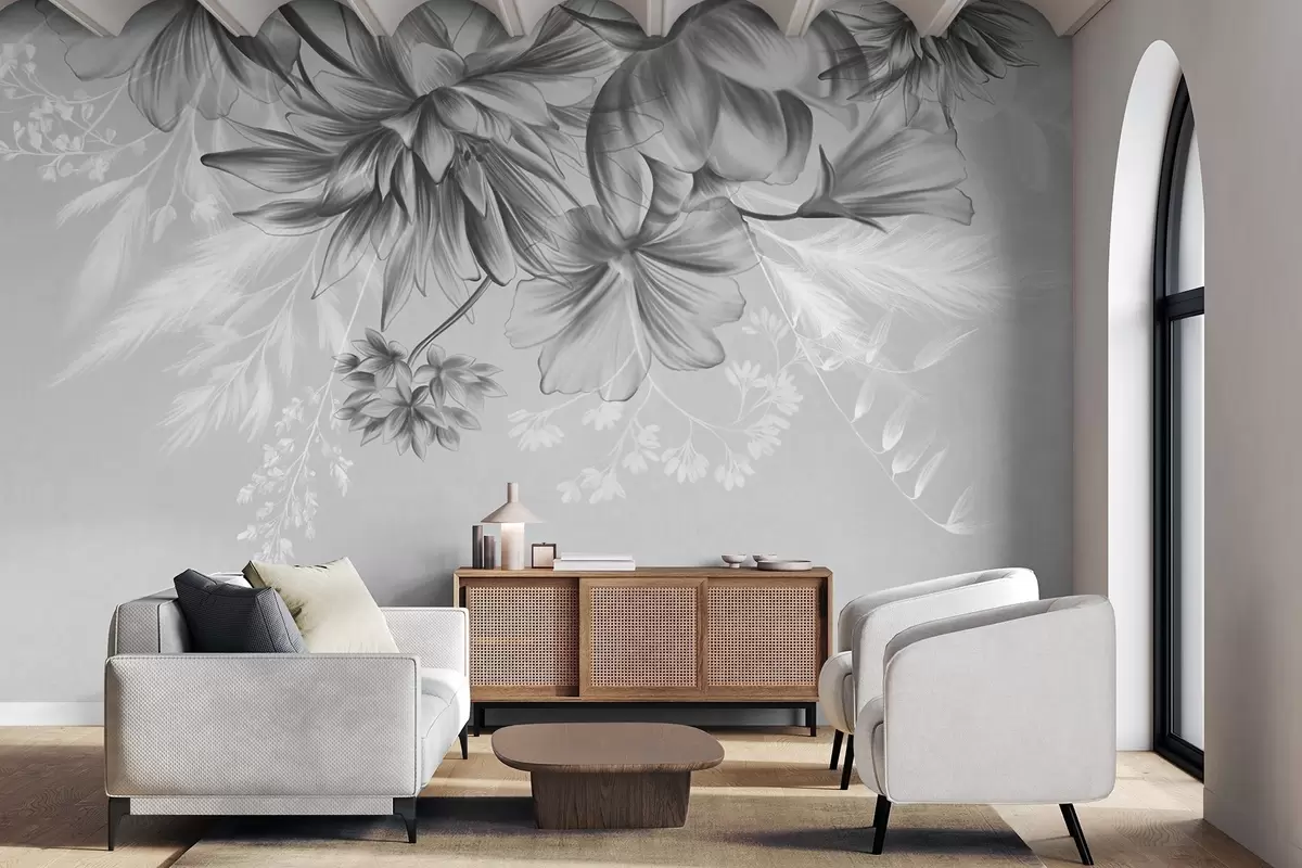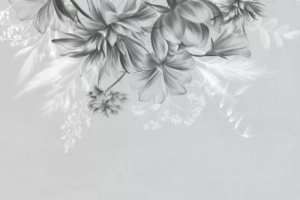 Fototapetes Teksturēti ziedi un papardes tumši pelēkā un baltā krāsā uz klusā pelēkā fona zīmējuma stilā Nr. w09644v1