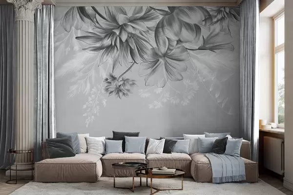 Fototapetes Teksturēti ziedi un papardes tumši pelēkā un baltā krāsā uz klusā pelēkā fona zīmējuma stilā Nr. w09644v1