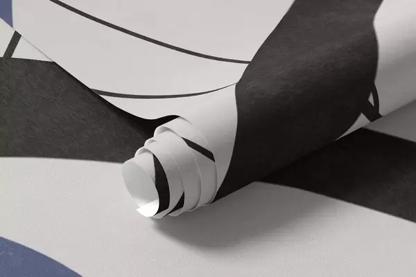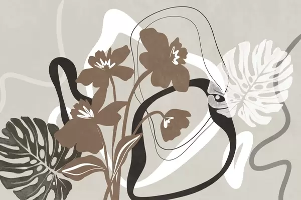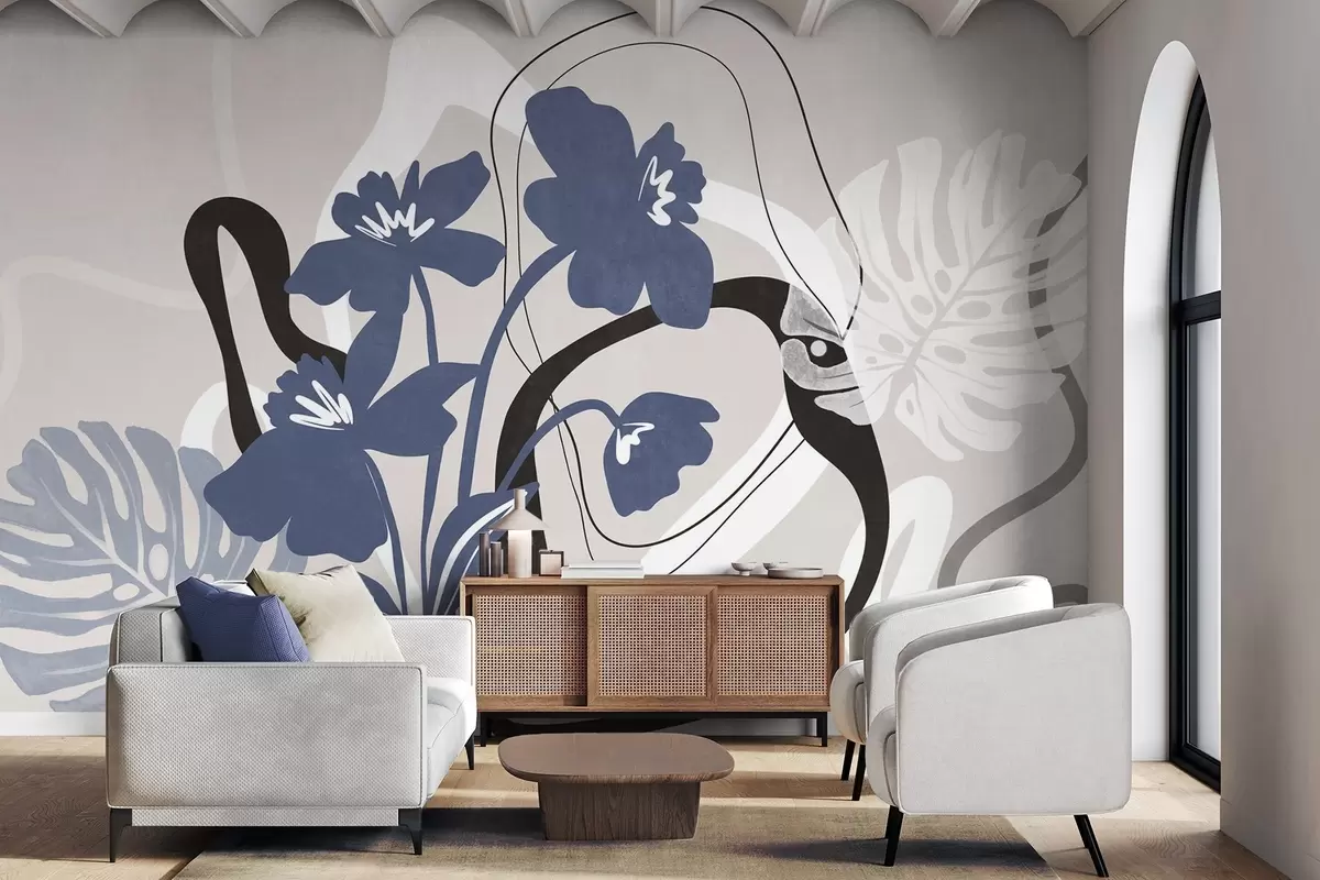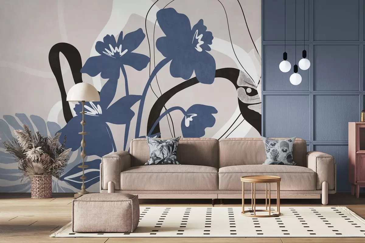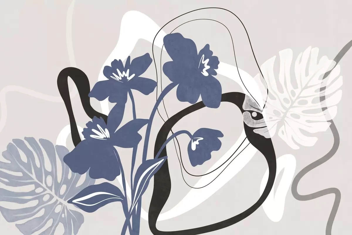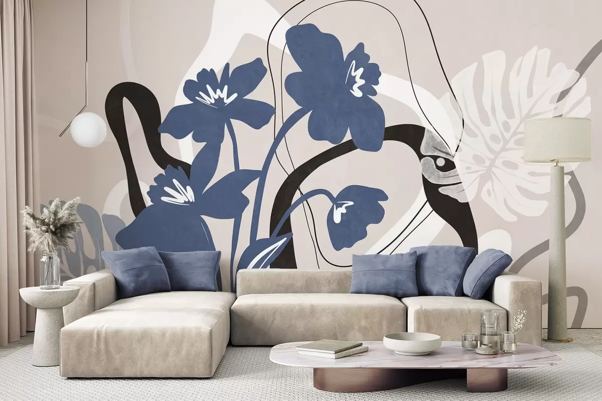 Fototapetes Abstraktas tekstūras zilas puķes ar baltām un melnām formām uz gaiši smilškrāsas fona, minimālisma māksla Nr. w09645