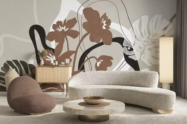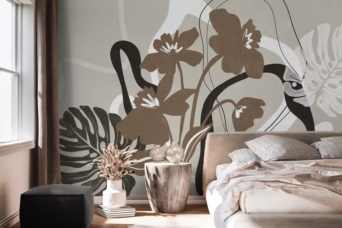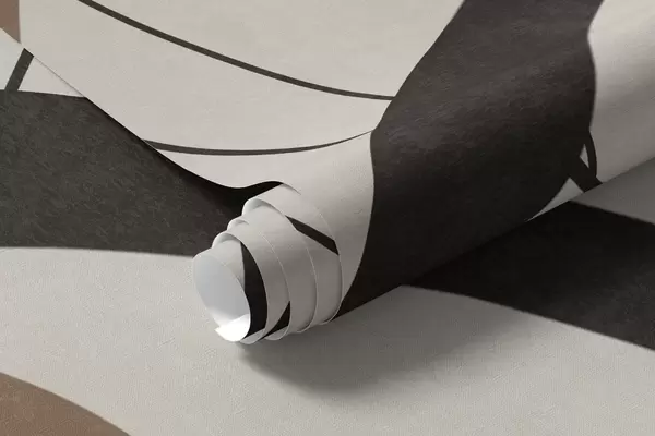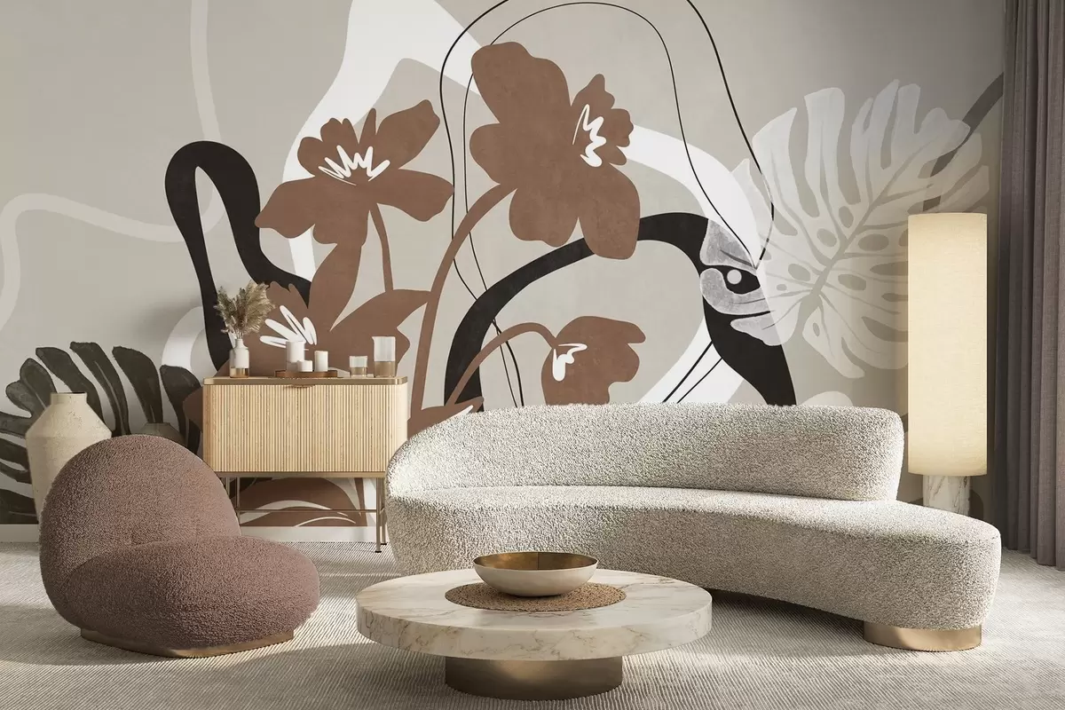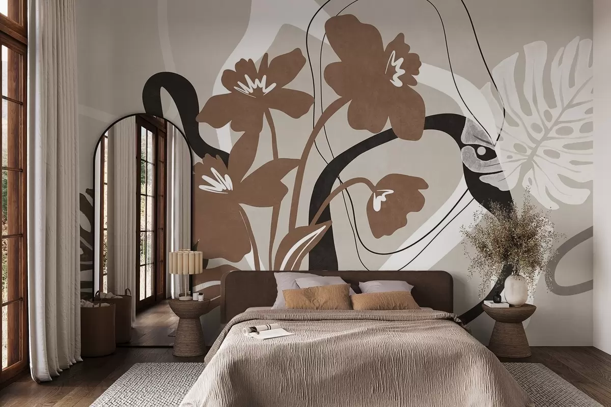 Fototapetes Abstraktas tekstūras brūnas puķes ar baltām un melnām formām uz smilškrāsas fona, minimālisma māksla Nr. w09645v1