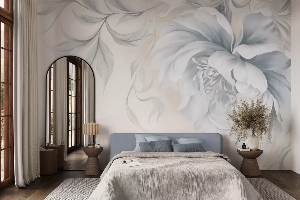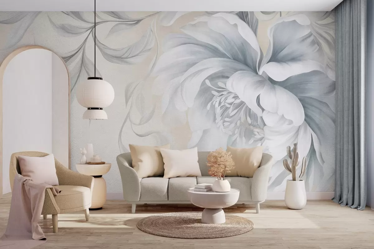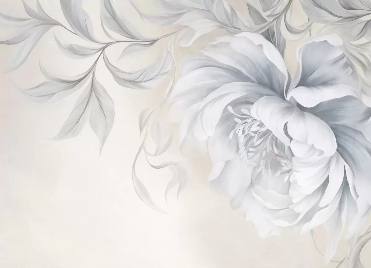 Fototapetes Liels, faktūrs bagāts peonijs ar maigiem ziedlapiem un pelēkām lapām, attēlots maigā stilā Nr. w09647