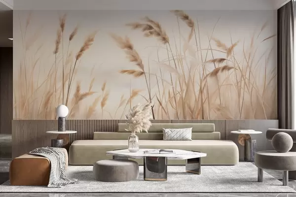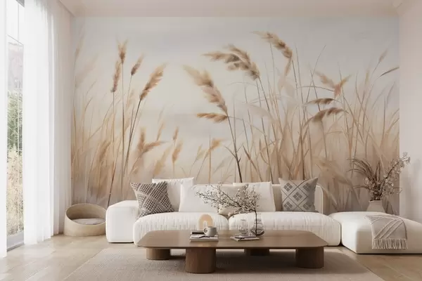 Fototapetes Augsta, teksturēta sausa zāle ar kviešu vārpām laukā uz maiga, gaiša fona Nr. w09648