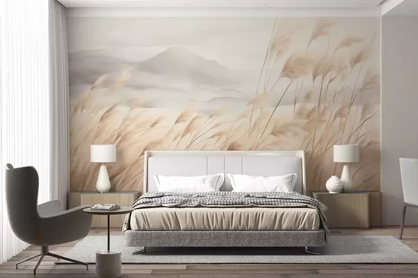 Fototapetes Teksturēts kalnu ainava ar augstu, sausu zāli zem miglas apklāta debesīm Nr. w09649