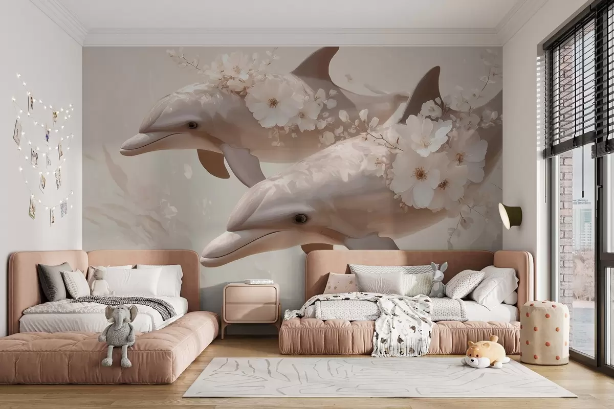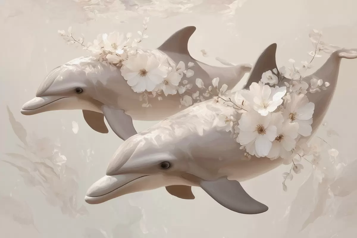Fototapetes Delfīni jūrā, kas peld delikātu ziedu un maigas gaismas vidū Nr. w09666