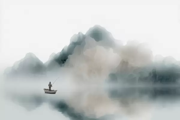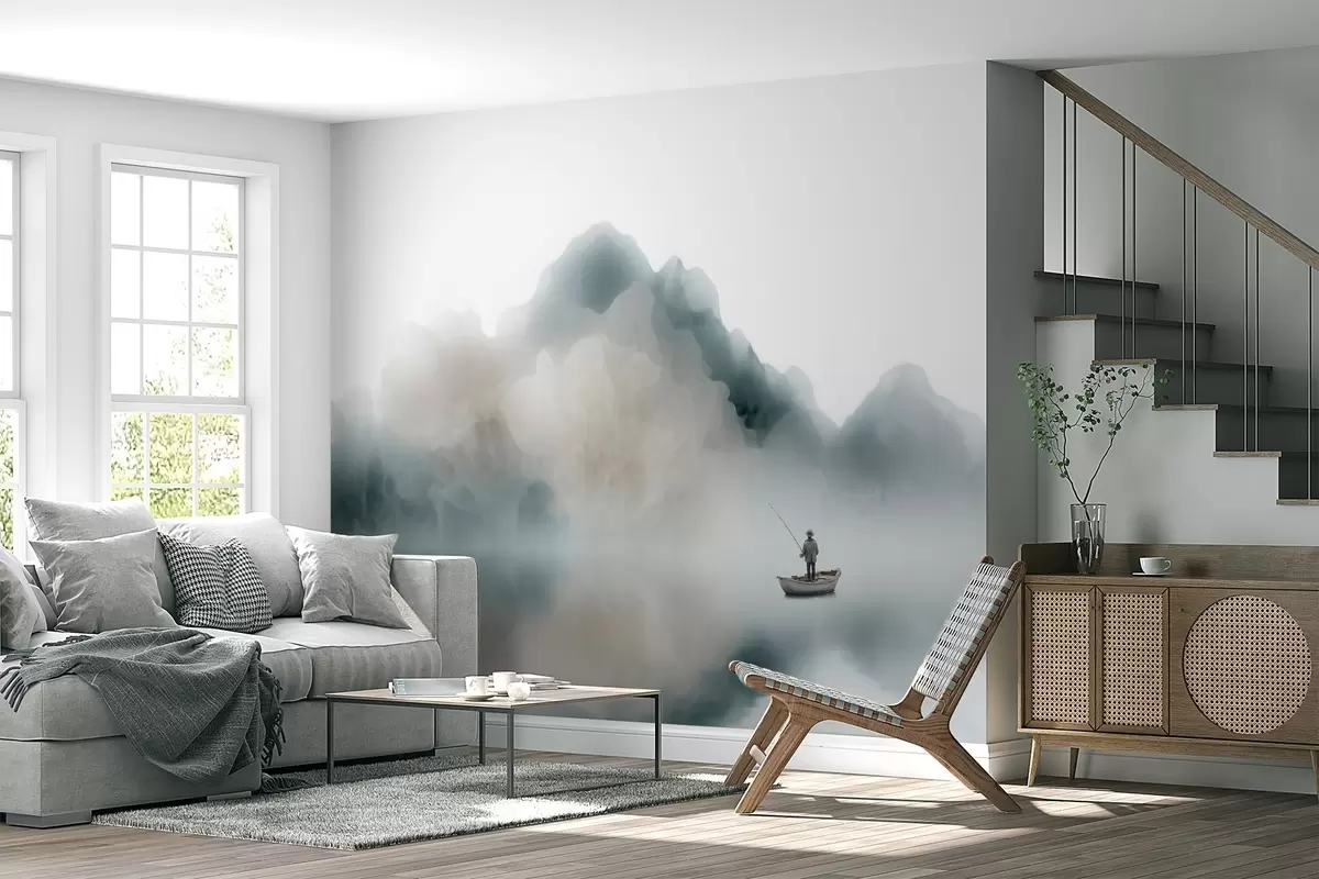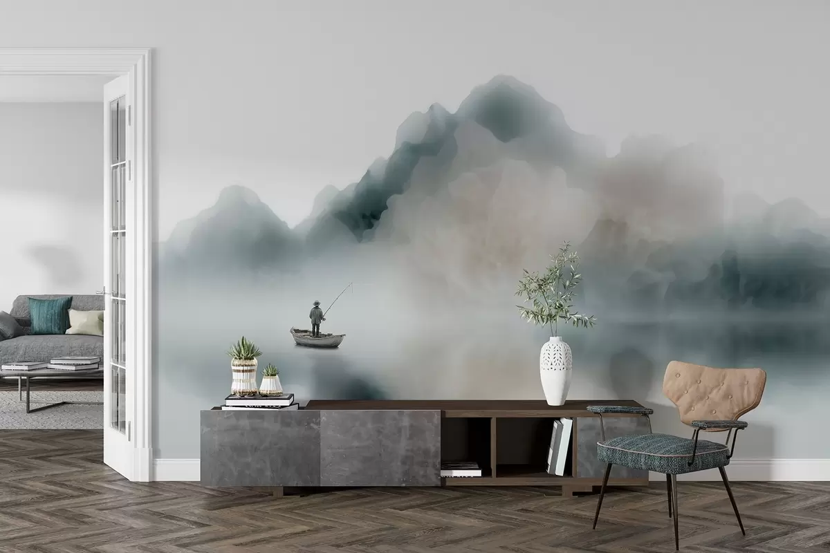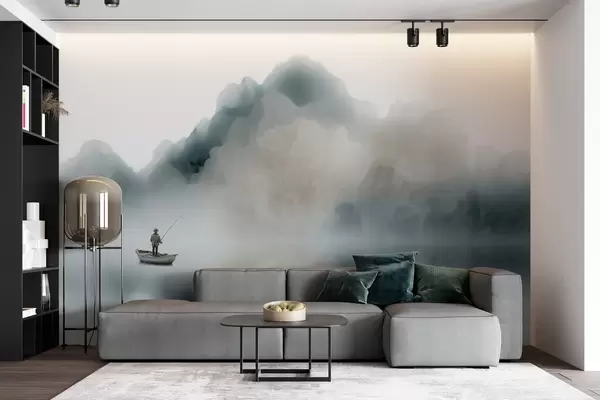 Fototapetes Kalnu ainava ar laivu un zvejnieku, kas pazūd maigā miglā Nr. w09678