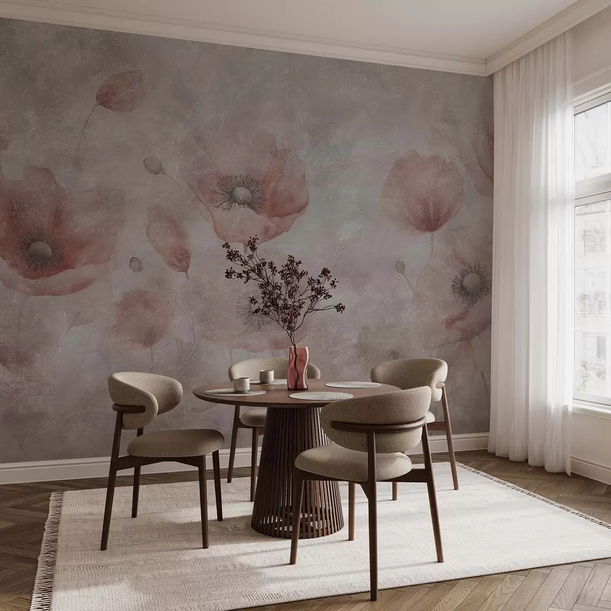 Fototapetes Lieli magoņu ziedi uz sienas ar antīku efektu Nr. w09686