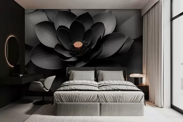 Fototapetes Minimālisma stilā veidota melna zieda ar ziedlapām un kontrastējošu siltā toņa vidu Nr. w09721
