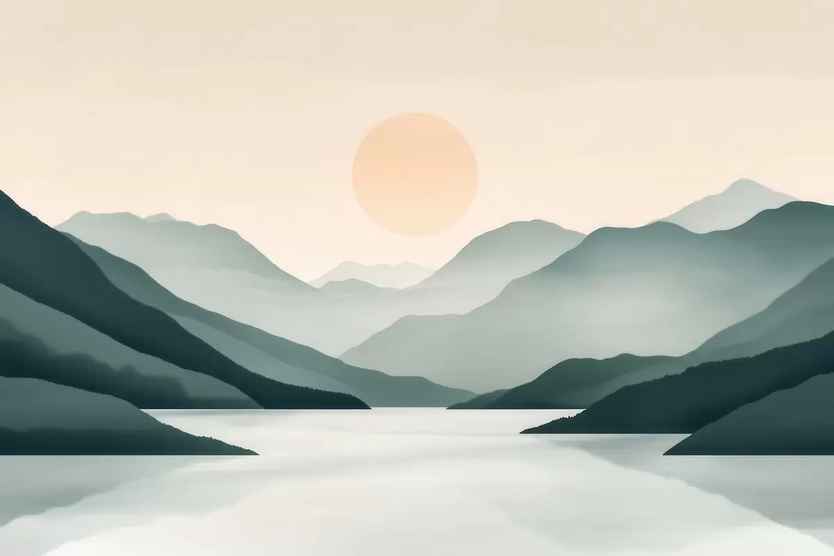Fototapetes Klusa kalnu ainava ar sauli virs ezera Nr. w09735