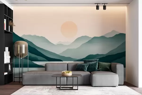 Fototapetes Klusa kalnu ainava ar sauli virs ezera Nr. w09735