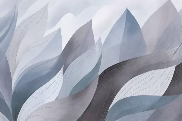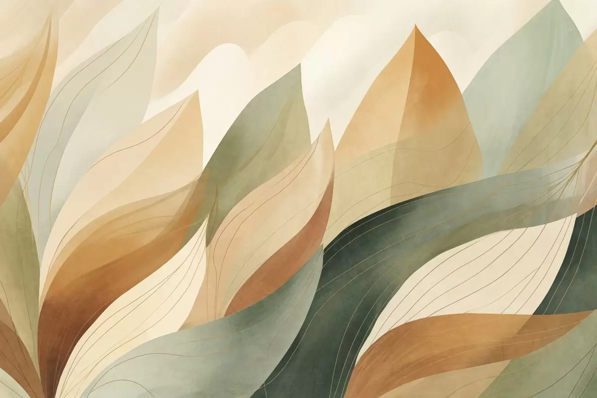 Fototapetes Abstraktas lapas, klusināti zemes toņi zaļā un oranžā krāsā ar smalkām līniju detaļām, maiga akvareļa tekstūra. Nr. w09736