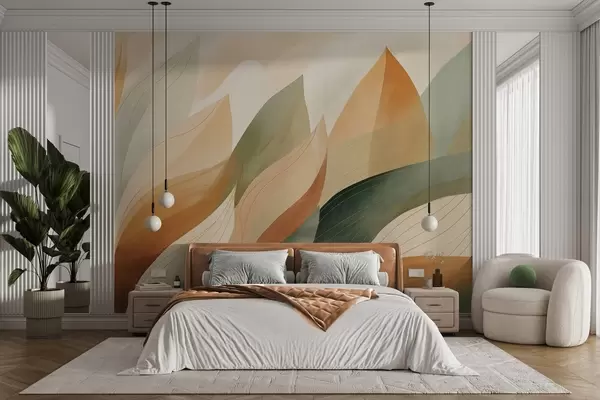 Fototapetes Abstraktas lapas, klusināti zemes toņi zaļā un oranžā krāsā ar smalkām līniju detaļām, maiga akvareļa tekstūra. Nr. w09736