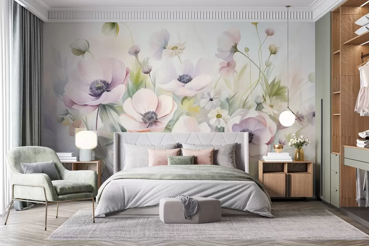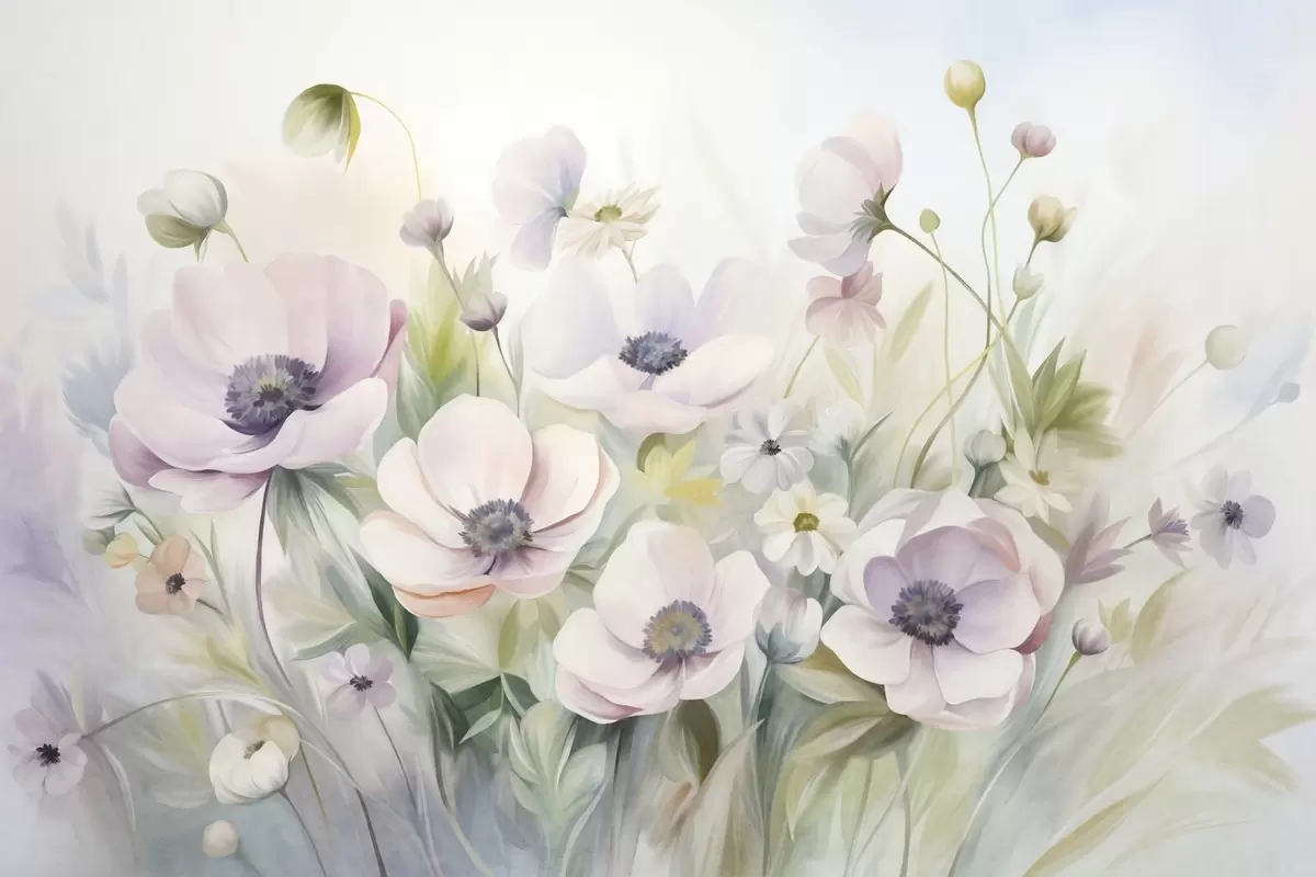 Fototapetes Pastelrozā un balto anemones ziedu lauks, zaļas lapas un mazas baltas margrietiņas Nr. w09742