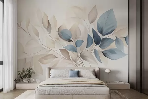 Fototapetes Abstraktas caurspīdīgas lapas zilas, smilškrāsas un krēmkrāsas toņos, faktūru māksla Nr. w09744