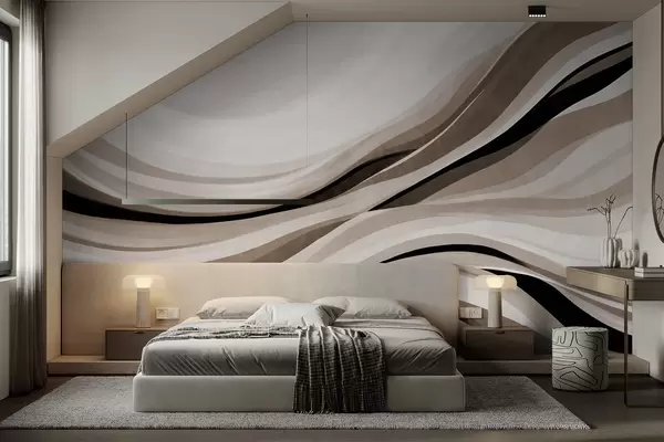 Fototapetes Abstraktas viļņotas līnijas smilškrāsas un melnā tonī uz gaiša fona, teksturēta māksla Nr. w09748