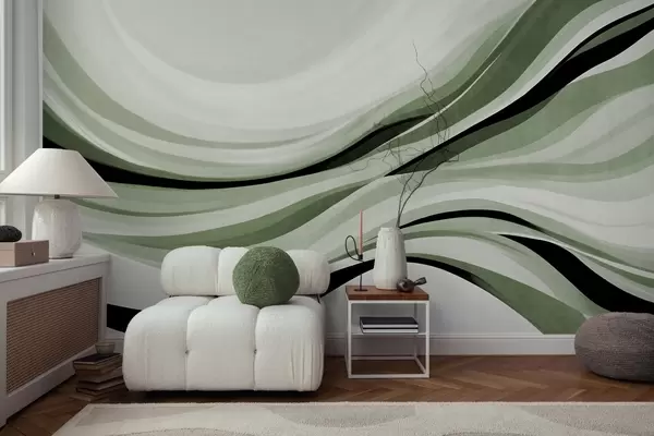 Fototapetes Abstraktas viļņotas līnijas zaļā un melnā krāsā uz gaiša fona, teksturēta māksla Nr. w09748v1