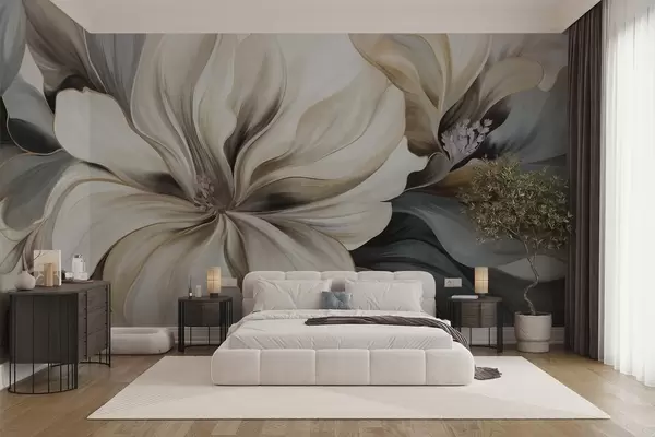 Fototapetes Lieli, krēmkrāsas magnolijas ziedi ar brūniem un pelēkiem lapām, maigs apgaismojums, abstrakts fons Nr. w09749