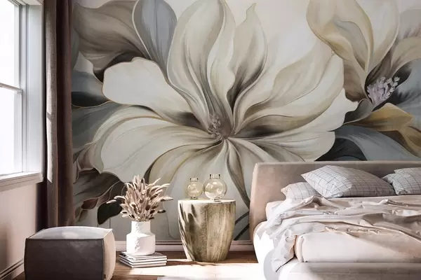 Fototapetes Lieli, krēmkrāsas magnolijas ziedi ar brūniem un pelēkiem lapām, maigs apgaismojums, abstrakts fons Nr. w09749