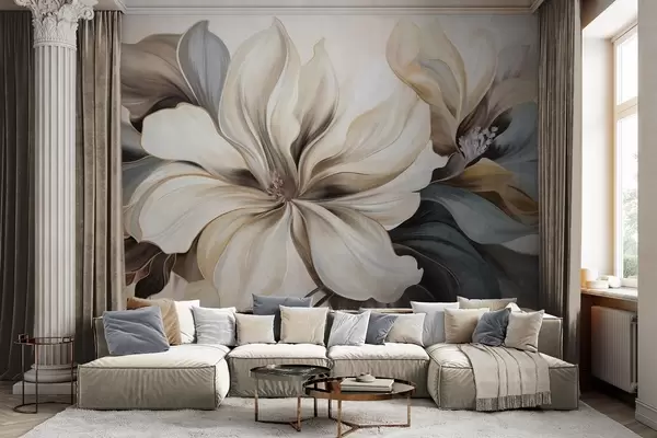 Fototapetes Lieli, krēmkrāsas magnolijas ziedi ar brūniem un pelēkiem lapām, maigs apgaismojums, abstrakts fons Nr. w09749