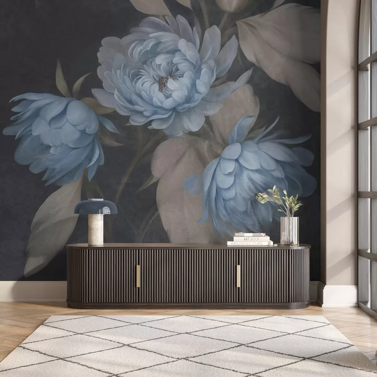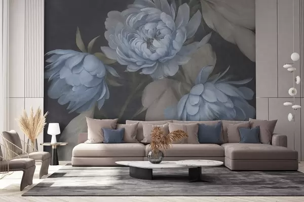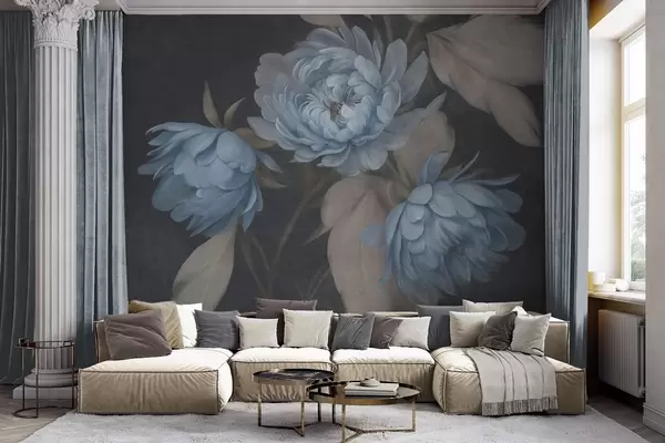 Fototapetes Teksturēti gaiši zili peoniju ziedi ar smilškrāsas lapām uz tumša fona Nr. w09751