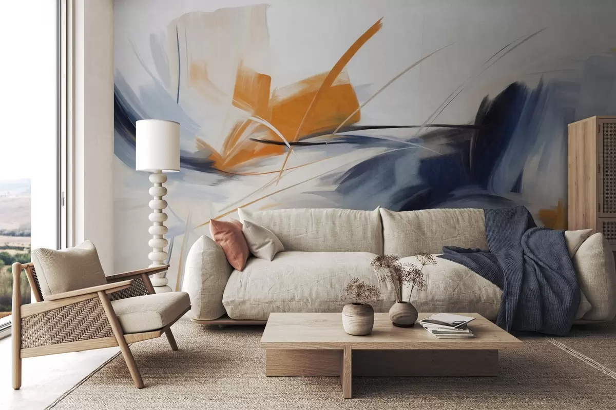 Fototapetes Abstrakts glezniecības stils ar oranžiem un ziliem teksturētiem triepieniem Nr. w09755