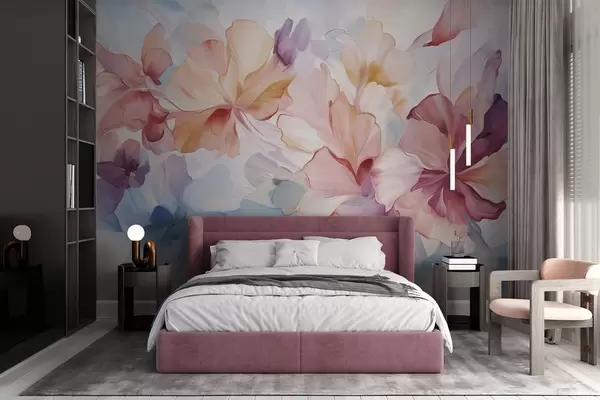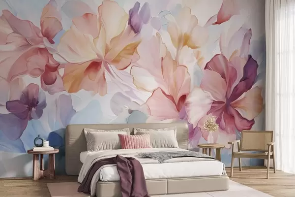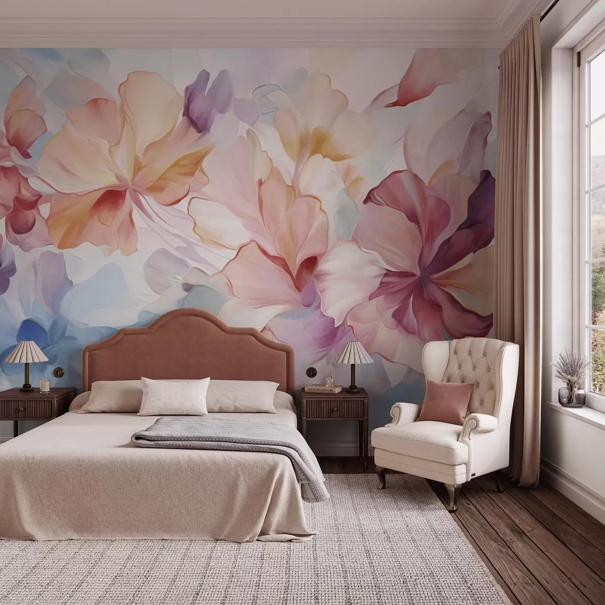 Fototapetes Abstraktas fantāzijas ziedi rozā, persiku un lavandas toņos glezniecības stilā, teksturēta māksla Nr. w09767