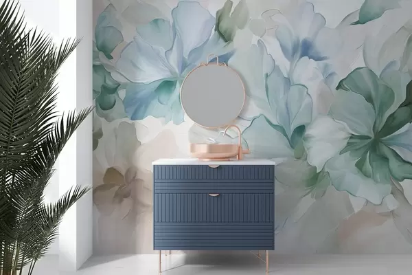 Fototapetes Abstraktas fantāzijas ziedi zaļos, zilos un smilškrāsas toņos glezniecības stilā, faktūrmāksla Nr. w09767v1