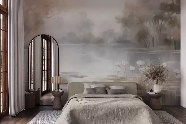 Fototapetes Reljefs ainava, ezers ar baltām ūdensrozēm, ko ieskauj koki klusās krāsās Nr. w09768