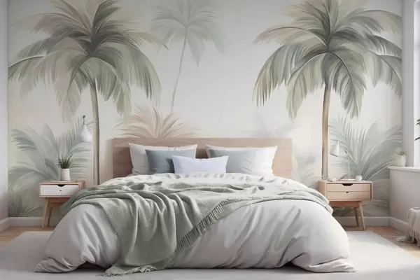 Fototapetes Palmu koki ar teksturētu lapotni, kuras klusināti zaļās un smilškrāsas lapas izceļas uz maiga debesu fona Nr. w09770
