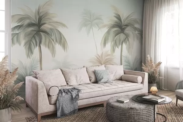 Fototapetes Palmu koki ar teksturētu lapotni, kuras klusināti zaļās un smilškrāsas lapas izceļas uz maiga debesu fona Nr. w09770