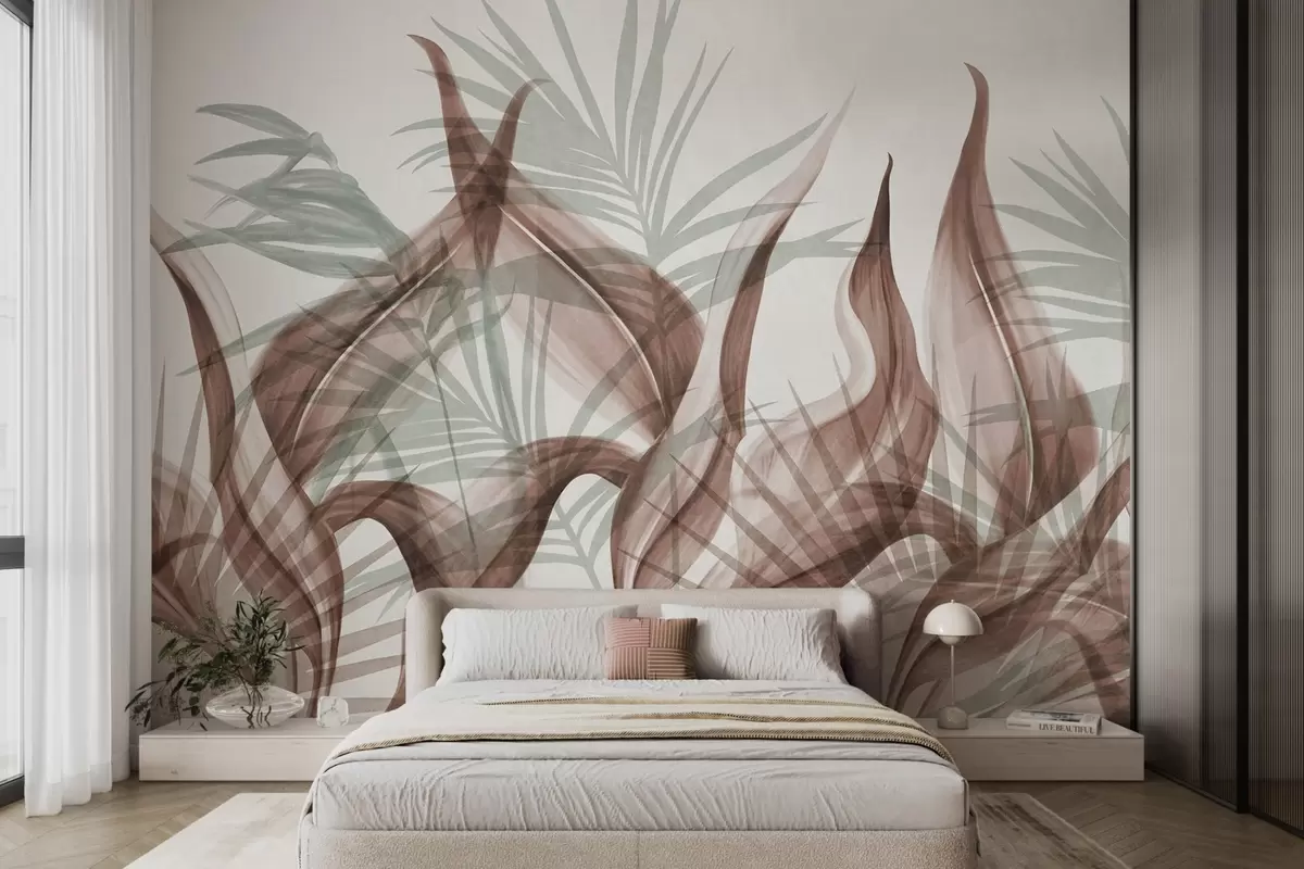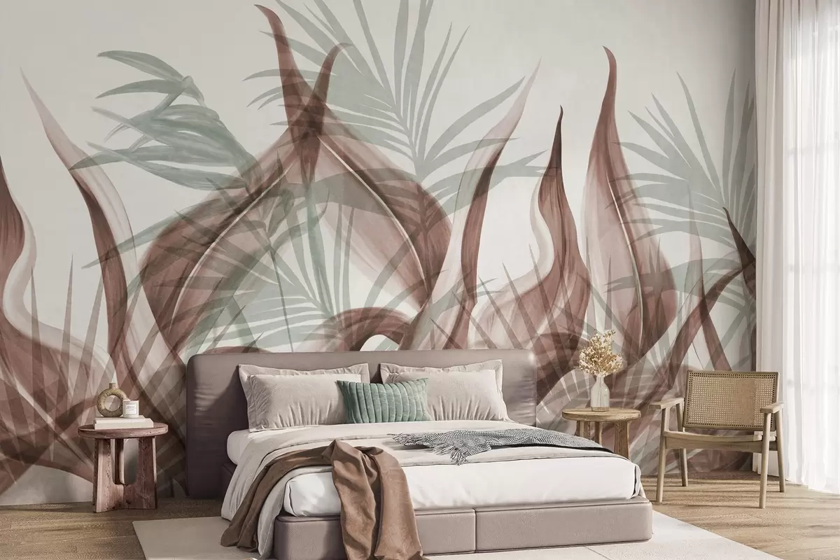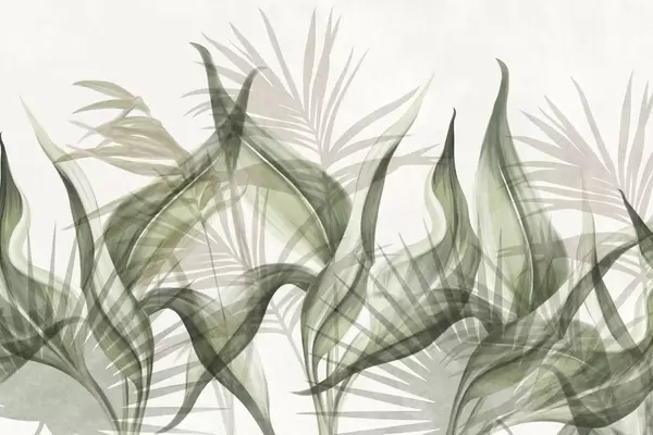 Fototapetes Tropu lapas brūnos un zaļos toņos uz balta fona, teksturēts akvareļa stilā Nr. w09772