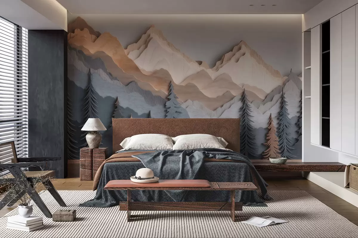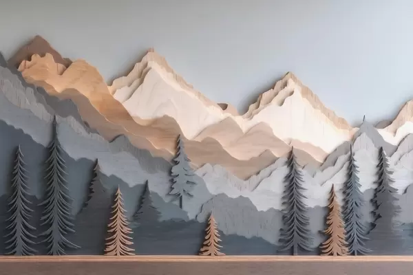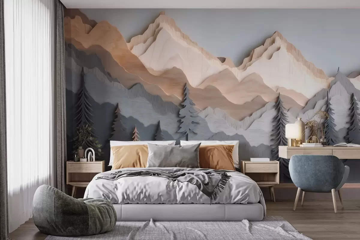 Fototapetes Dabas ainava ar priedēm un kalniem, izgatavota kokgriezuma stilā Nr. w09793