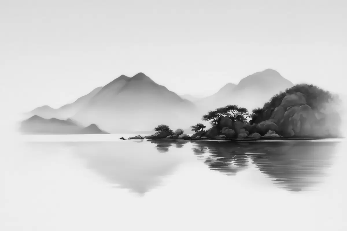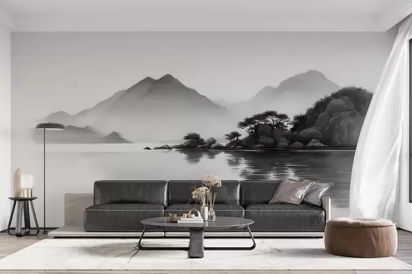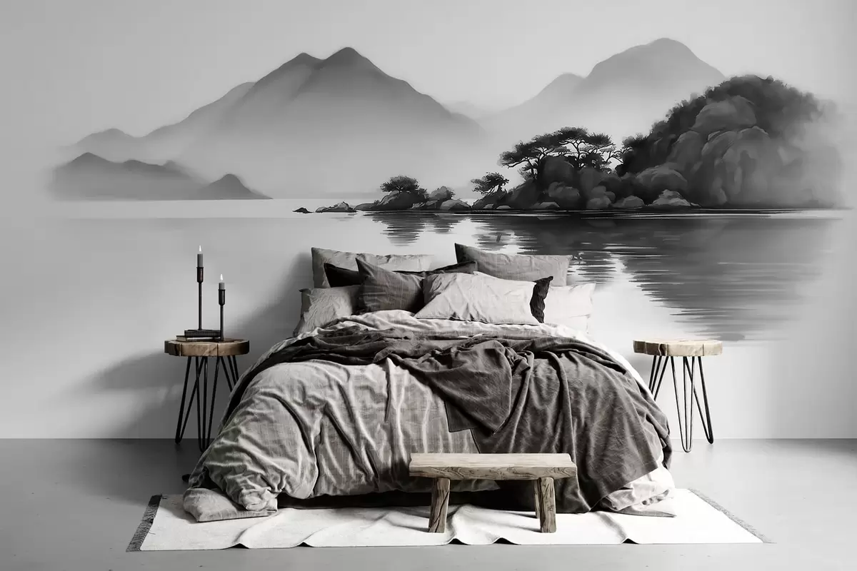 Fototapetes Melnbalta ainava ar kalniem un ezeru maigā miglā Nr. w09803