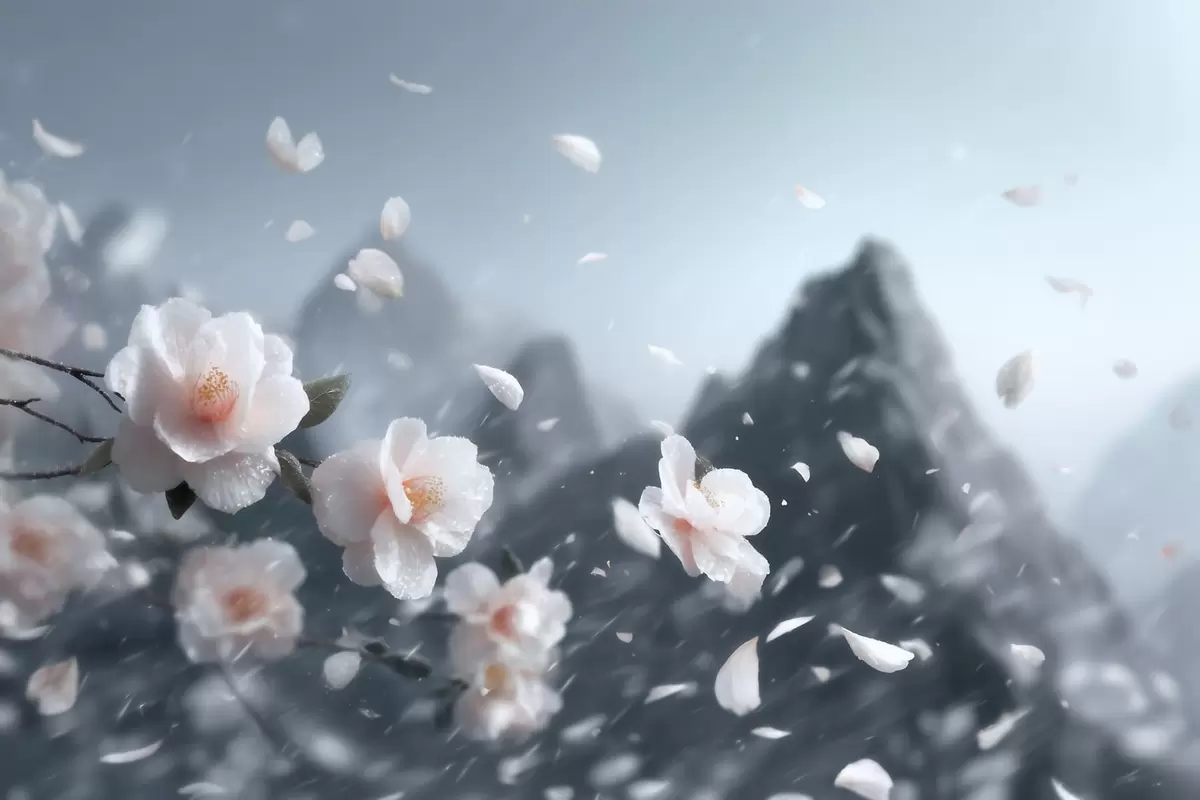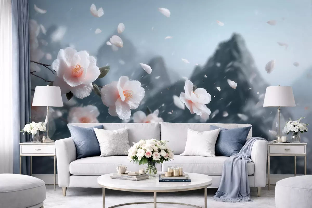 Fototapetes Maigi ziedošas ķiršu ziedi kalnu fonā, noskaņojuma pilns japāņu ainavas skats pasteļtoņos Nr. w09808