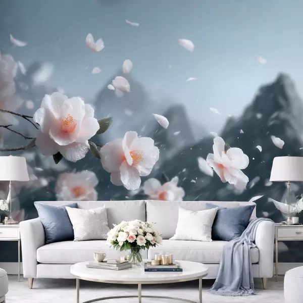 Fototapetes Maigi ziedošas ķiršu ziedi kalnu fonā, noskaņojuma pilns japāņu ainavas skats pasteļtoņos Nr. w09808