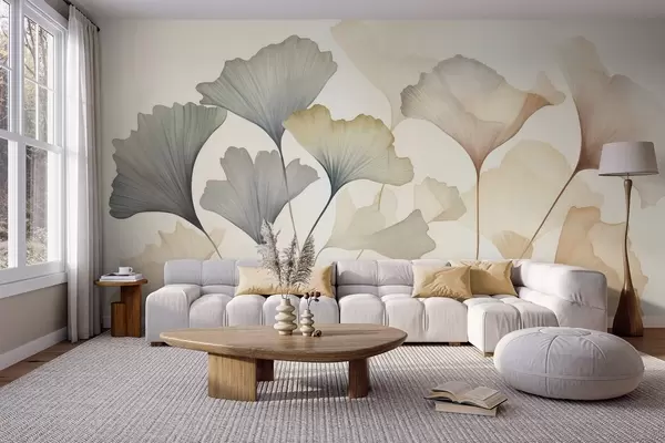 Fototapetes Ginkgo lapu abstrakcija klusās pasteļtoņos, piemēram, zilā, zaļā un persiku krāsā, teksturēts mākslas darbs Nr. w09810