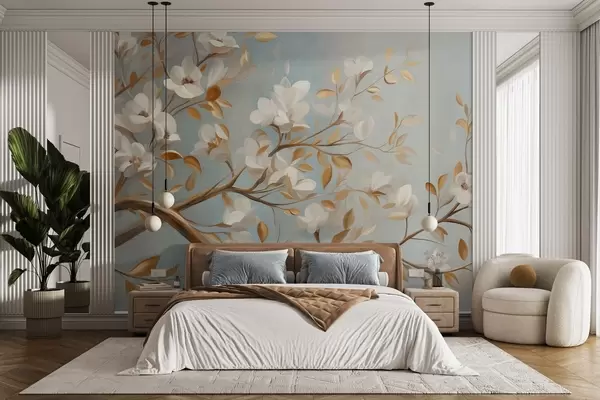 Fototapetes Teksturēta koka zaru ar baltiem ziediem un dzeltenām lapām, vintage stilā Nr. w09814