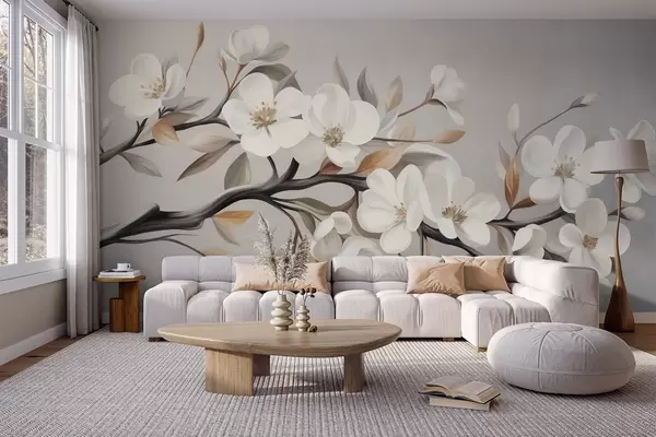 Fototapetes Teksturēta zariņa ar baltām ziediem un brūnām lapām uz gaiši pelēka fona Nr. w09817