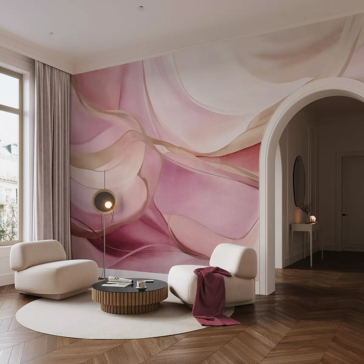 Fototapetes Abstraktas, faktūru bagātas, plūstošas formas rozā un smilškrāsas toņos ar maigām dzeltenām līnijām Nr. w09818